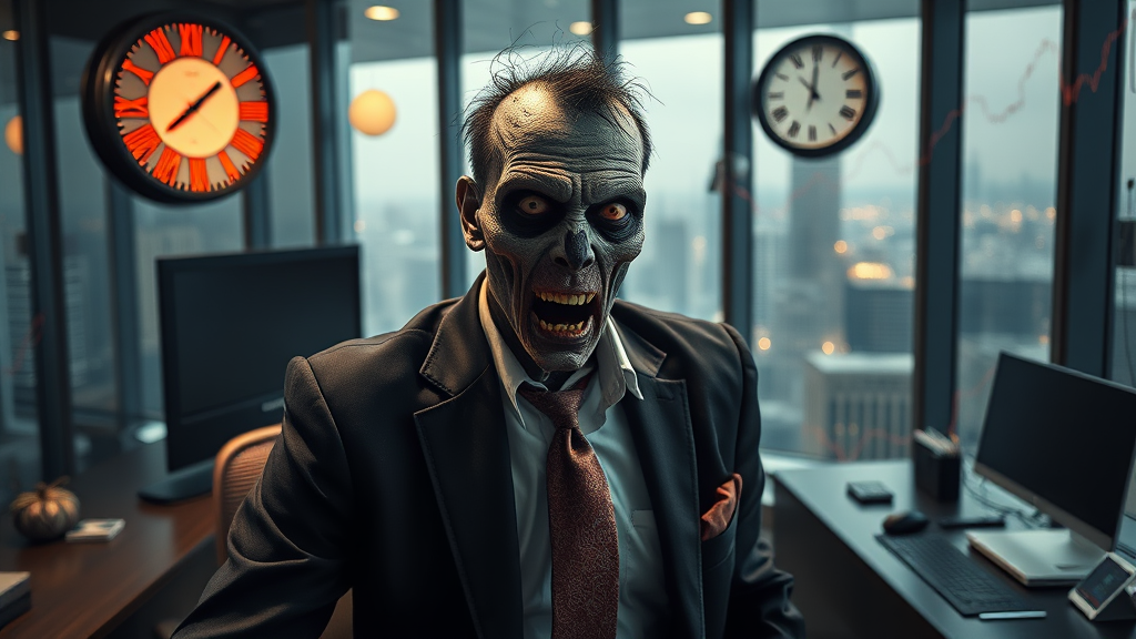 A ruthless zombie CEO, commanding presence in a sleek high-rise office, surrounded by surreal elements like melting clocks and floating stock charts, captured with the dreamy bokeh of a Sony FE 70-200mm f/2.8 GM OSS Lens, showcasing an eerie blend of corporate power and otherworldly decay.