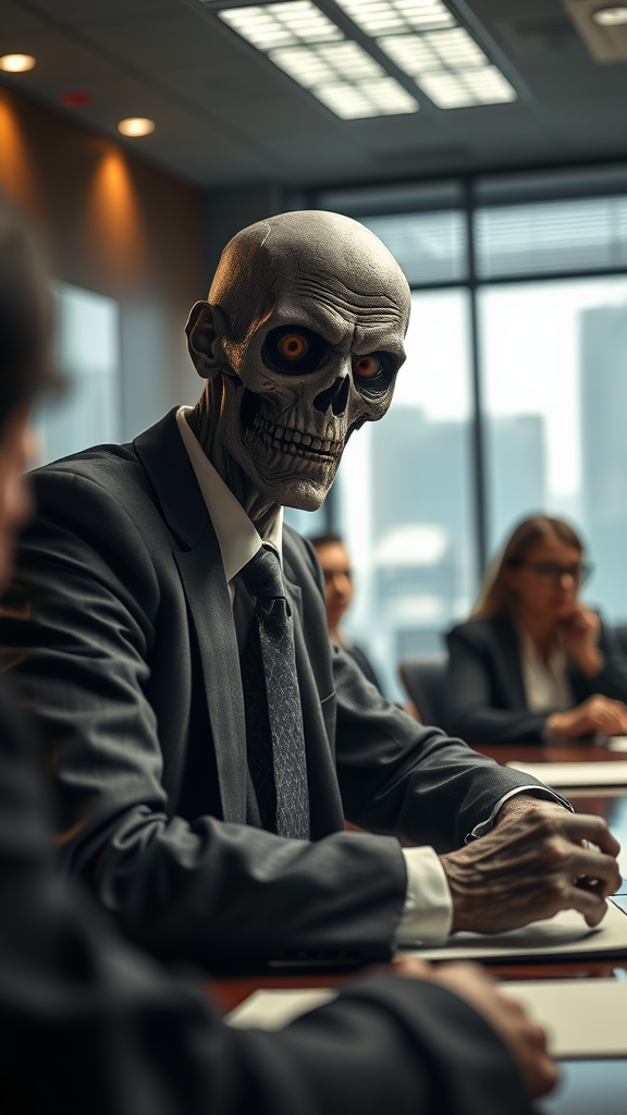 A ruthless zombie CEO presiding over a Fortune 500 company boardroom, the surreal scene captured mid-discussion with uncanny precision, using a Sony FE 70-200mm f/2.8 GM OSS Lens; the undead executive, clad in a sharply tailored suit, exudes an eerie authority with hollow eyes staring intensely, bathed in a blend of ethereal office lights and shadows that distort reality, as bewildered yet compliant employees hang on his every word.