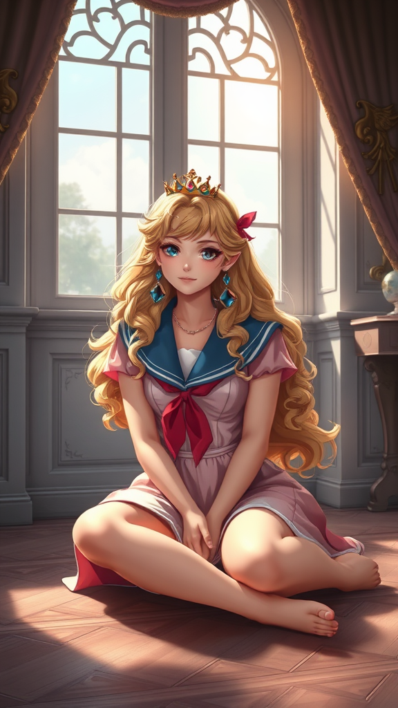 A sailor girl seated on the floor in an elegant room with a large window, capturing the essence of a regal yet adventurous spirit. Next to her, a beautifully detailed portrait of a princess inspired by Princess Peach, with human-like features and a glowing, juicy peach complexion. The scene is rendered in 8k high quality, showcasing an exquisite level of detail reminiscent of Artgerm’s style. The art features an intricately designed blonde-haired princess, embodying fantasy and elegance. This fanart is among the finest on ArtStation and Danbooru, highlighting an extraordinary super-detailed render of a mesmerizing royal figure.
