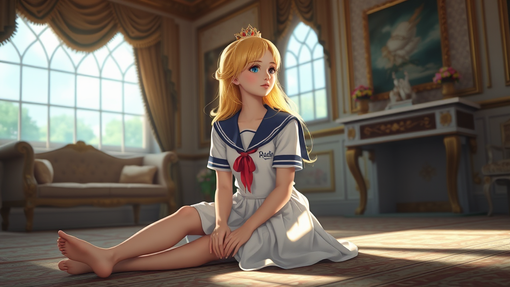 A sailor girl with blonde hair sits gracefully on the floor of an elegantly decorated room, her gaze directed towards a large window that lets in the soft glow of daylight. The room is adorned with tasteful furnishings, enhancing its regal ambiance. She embodies a princess-like aura, reminiscent of the iconic Princess Peach, yet with a unique human resemblance to a luscious, ripe peach. This scene is captured in an 8k high-quality render, showcasing intricate details and vibrant colors, inspired by the exquisite fanart styles of Artgerm and famed platforms like Artstation and Danbooru. Her delicate features and flowing blonde locks give her an ethereal presence worthy of the finest princess portraits, blending classic charm with a modern, artistic twist.