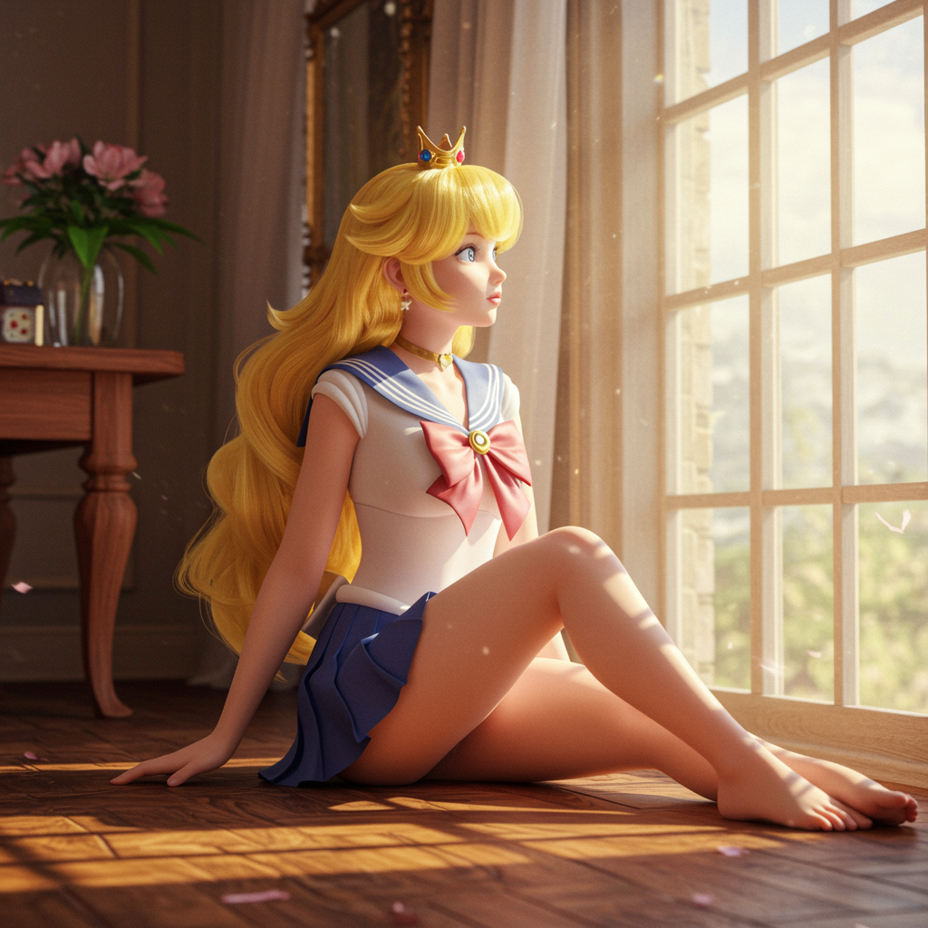 A sailor-themed girl sitting gracefully on the floor of a sunlit room, her gaze directed out of a large window. She's inspired by the elegance of a royal figure, reminiscent of a well-known blonde-haired princess, offering a nod to familiar iconography without direct reference. Her attire and style evoke the charm of a human-like, vibrant peach, blending seamlessly into the scene. The setting is captured in an 8k high-quality render, showcasing intricate details typical of exquisite fanart, merging influences from renowned platforms like ArtStation. The composition highlights her as the focal point in this super detailed and imaginative portrait.