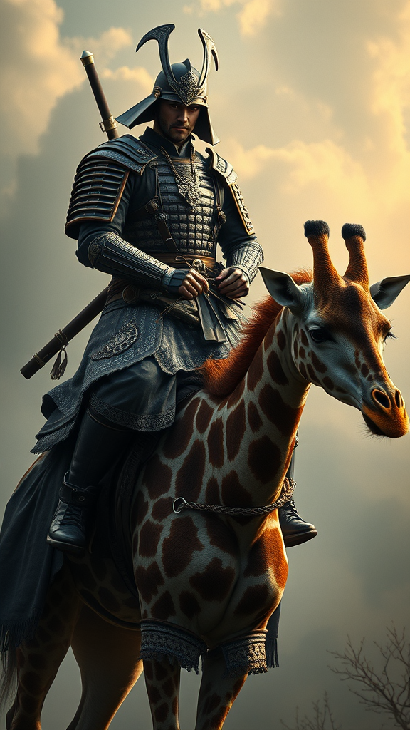 A samurai clad in traditional armor riding majestically atop a graceful giraffe, intricately intertwined with swirling DNA patterns, captured in a photorealistic style reminiscent of Dmitri Danish. The scene is imbued with the emotional depth and atmospheric quality characteristic of Marcin Sobas, where the samurai's stoic expression contrasts with the gentle curiosity in the giraffe's gaze. The artwork emphasizes the bond between the warrior and his unusual steed, set against a mystical, softly lit landscape that enhances the emotional resonance of the moment.
