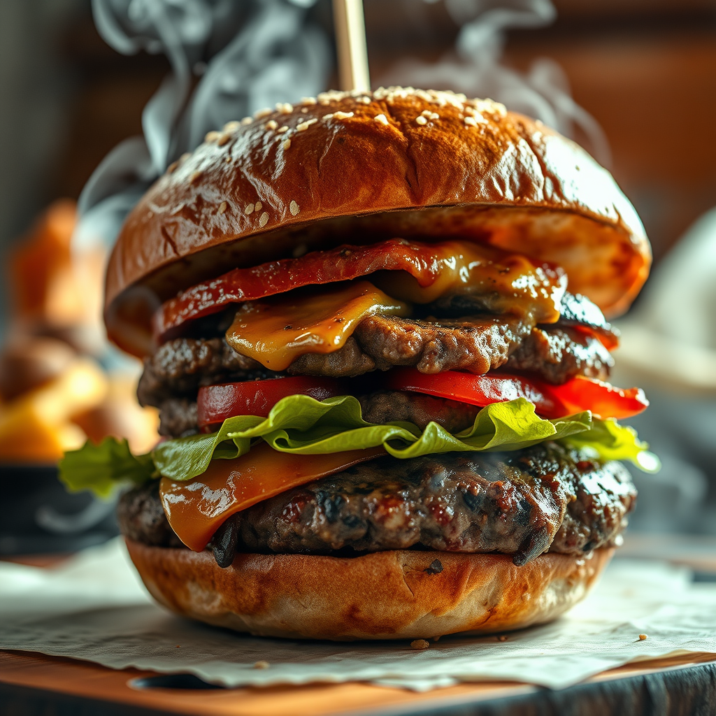 A savory burger tumbling in parts, mouthwatering, aromatic, steaming, striking image, elaborate details with a hint of HDR, cinematic flair, enhanced through adobe lightroom, showcasing exquisite detailing.