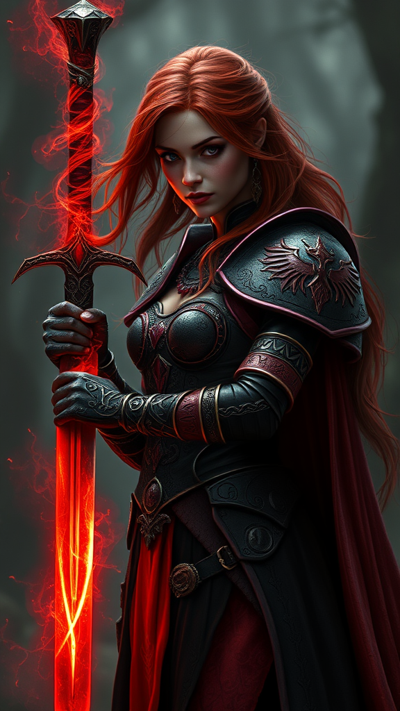 A scarlet-haired enchantress stands before me, her fiery tresses and smoldering gaze cutting through the shadows. She is clad in sinister black and crimson armor, adorned with unsettling blood-red runes, etchings alive with the essence of dark magic. In her grasp, a sword shrouded in a crimson mist, its luminescence spiraling up her arm like a pulsing lifeline. Her intense eyes lock onto mine, and I feel the oppressive weight of her formidable power as the air itself crackles with an unearthly heat.