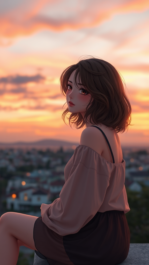 A scene depicting a single girl with wavy brown medium-length hair and a curvaceous figure, set in an anime style. She is sitting against the backdrop of a stunning sunset at 8:30 pm, with the sky painted in beautiful hues. The environment reflects a hyperrealistic human depiction, capturing her full body in detailed clothing with cinematic lighting. The image boasts sharp focus using an f/1.8 aperture and an 85mm lens, with smooth volumetric fog adding depth. The artwork is designed to be visually striking, fine-tuned for trending on platforms like Instagram and Tumblr, in high-resolution HDR 4K and 8K quality, showcasing intricate and highly detailed elements. The lighting captures a soft blush on her cheeks, enhancing her stunning beauty. While maintaining these features, the composition avoids any distortions or misplaced body parts, ensuring a cohesive and harmonious representation, free from any beginner-level art flaws such as poor anatomy, low contrast, or exposure issues.