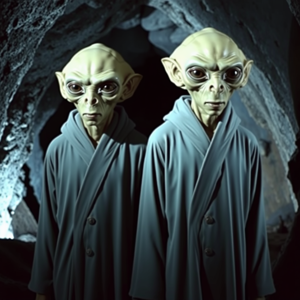A scene from a classic sci-fi TV series, featuring a pair of alien humanoid twins dressed in light gray robes, standing side by side in a mysterious, dimly lit cavern. Their heads are unusually large, and they face forward with an enigmatic expression, capturing the essence of retro sci-fi aesthetics. The environment is filled with shadows, creating an atmosphere of suspense and intrigue.