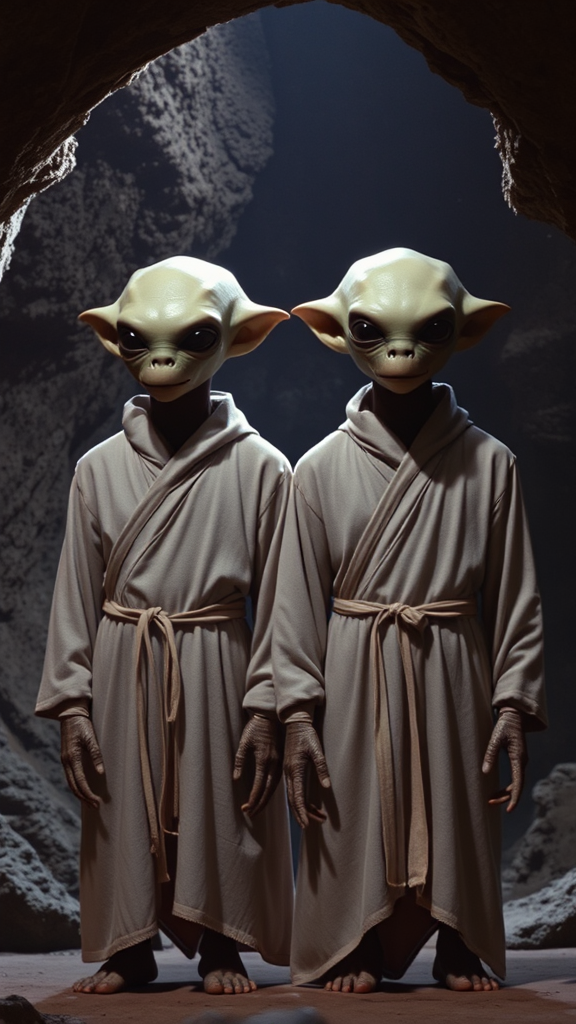 A scene from a classic sci-fi TV series shows two alien humanoid twins dressed in pale gray robes, standing side by side in a dimly lit, mysterious cave environment. The twins have remarkably large heads, gazing directly ahead, capturing the essence of a vintage sci-fi television show with a touch of eerie ambiance.