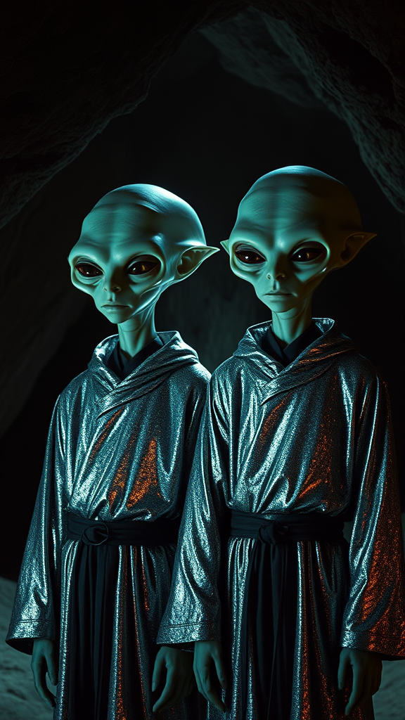 A scene from a retro sci-fi TV series, depicting two alien humanoid twins with oversized craniums, clad in shimmering silver robes. They stand side by side in a mysterious, dimly lit cavern, their expressions calm and enigmatic. The twins face forward, illuminated by an ethereal glow that highlights the eerie atmosphere of the cave setting. The mood is reminiscent of classic 1960s sci-fi television, capturing the nostalgic essence of the era.