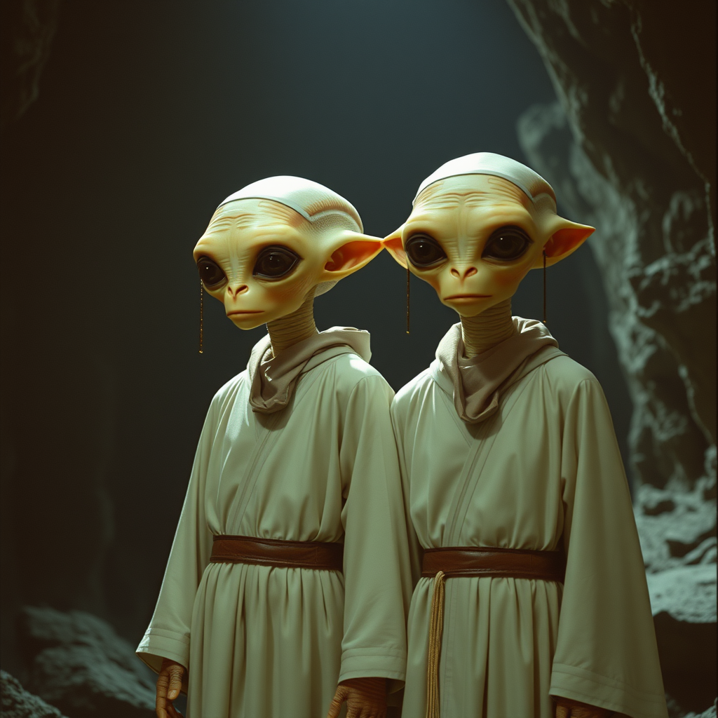 A scene from a vintage sci-fi TV series, depicting two alien humanoid twins in pale silver robes, standing side by side in a dimly lit, mysterious cavern. Their unusually large heads are turned towards the viewer. The setting captures the essence of a retro science fiction show.
