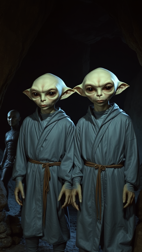A scene from a vintage sci-fi TV series showcases two alien humanoid twins clad in silvery gray robes, standing side by side in a shadowy, mysterious cave. Their heads are unusually large, with features that emphasize their exotic origins. The twins face the camera directly, capturing the feel of a classic retro sci-fi atmosphere. The setting is ominous yet intriguing, reminiscent of an era when exploration and mystery were at the forefront of cosmic storytelling.