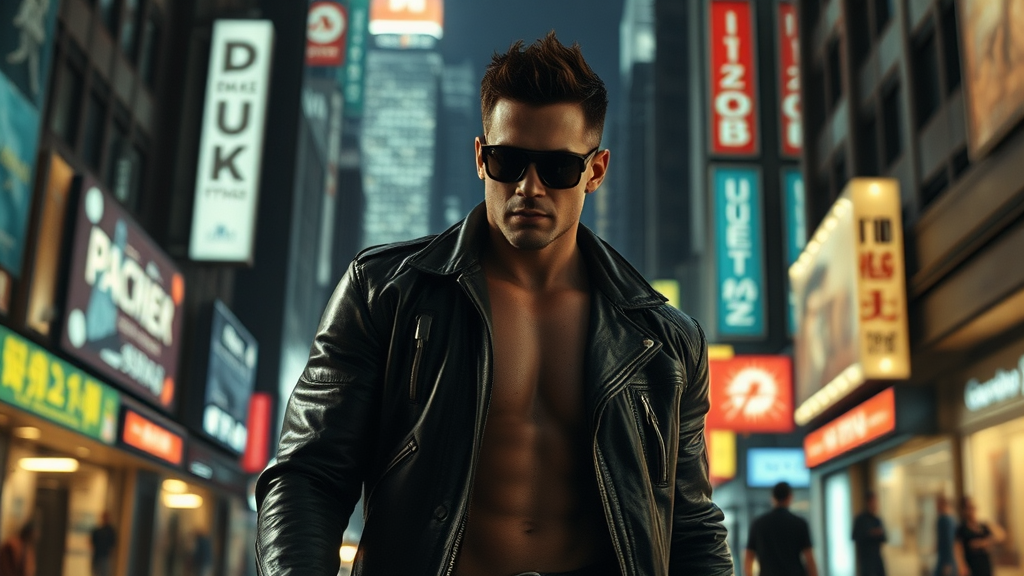 A scene from the early 2000s live-action sci-fi film featuring a muscular cyborg portrayed by a well-known action star, navigating a dimly lit, dystopian cityscape. The character, donned in a leather jacket and dark sunglasses, is bathed in the neon glow of futuristic advertisements. Directed by a renowned filmmaker, the movie captures the tense anticipation of an imminent showdown.