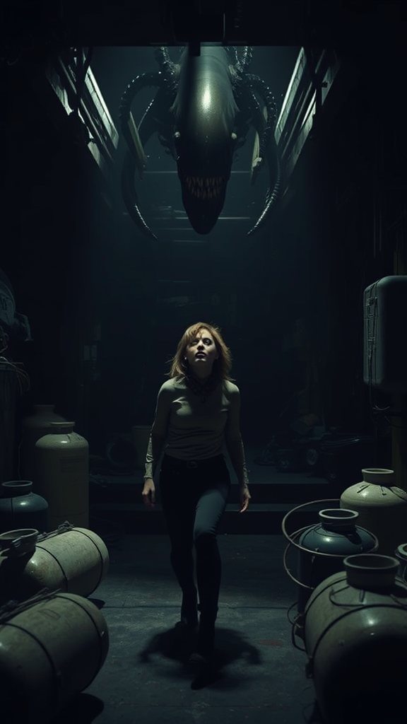 A scene inspired by "ALIEN" in the iconic Ridley Scott style features a menacing extraterrestrial creature looming above with Ellen Ripley, portrayed by Sigourney Weaver, standing in terror. She screams desperately, attempting to flee the imminent threat. The setting is a dimly lit, shadow-filled space where equipment like oxygen tanks are scattered around. The ambiance is grim with a darkly lit room, captured in a wide shot reminiscent of a raw photograph taken with a Sony ALPHA 7R V. The image echoes a film-like look, with cinematic lighting that emphasizes the tension and drama of the moment.