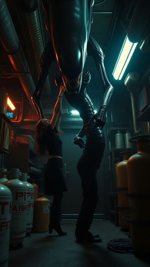 A scene inspired by the movie "ALIEN" directed by Ridley Scott, featuring an ominous alien creature towering over Ellen Ripley, portrayed by Sigourney Weaver. Ripley screams in terror as she desperately tries to evade the creature. The setting is a shadowy, industrial space adorned with various equipment like oxygen tanks, evoking a claustrophobic atmosphere. The room is dimly lit, enhancing the tension. Captured as a raw photograph in the manner of a Sony ALPHA 7R V, the image boasts a gritty, filmic appearance with cinematic lighting. The composition is a wide shot that emphasizes the dramatic encounter between Ripley and the alien.