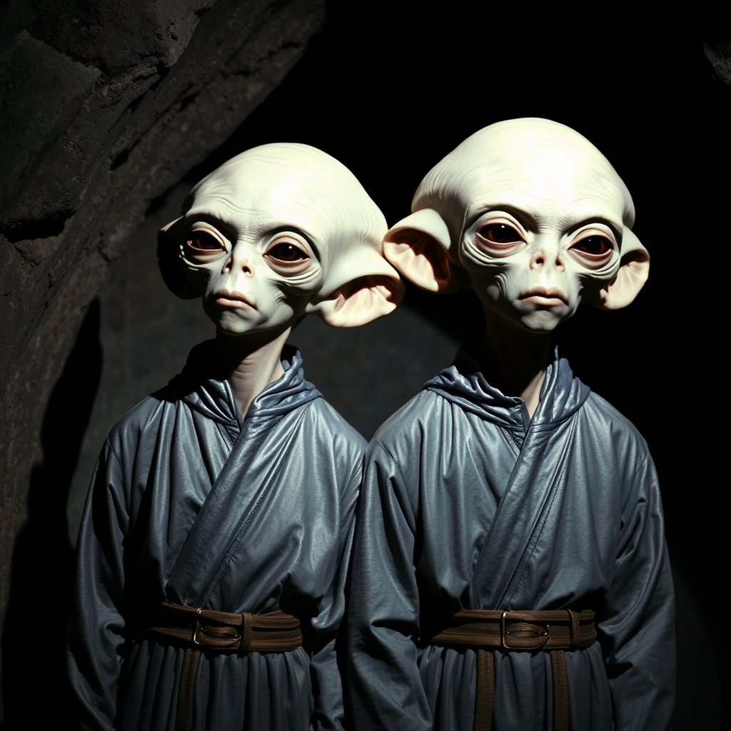 A scene reminiscent of a vintage sci-fi TV classic featuring two alien humanoid twins with oversized heads, dressed in silver-gray robes, standing side by side in a mysterious, shadowy cavern. The atmosphere is eerie and otherworldly, with dim lighting casting dramatic shadows. The twins gaze directly ahead, their expressions solemn, embodying the quintessential retro sci-fi style.