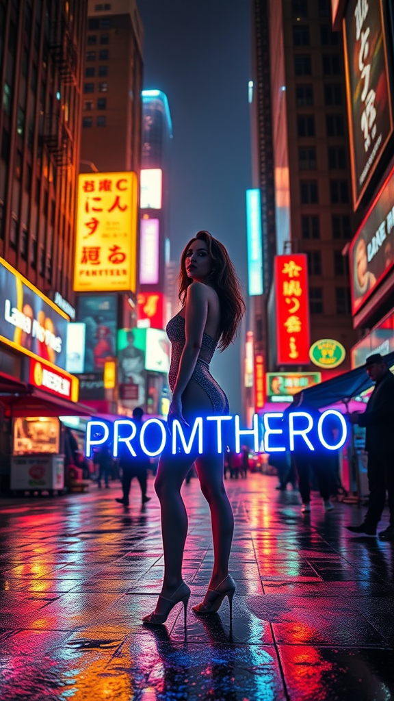 A scene unfolds on a bustling night street bathed in the vibrant glow of neon lights, capturing the essence of a cyberpunk metropolis. Amidst the electric hues, Lana Del Rey stands poised, her silhouette illuminated by the shimmering reflections on rain-soaked pavement. In her hand, a neon sign blazes the word "PROMTHERO," its letters flickering with an electric blue intensity. The backdrop features towering skyscrapers adorned with kaleidoscopic billboards, their lights dancing in synchronization with the pulsating beat of the city. Street vendors and mysterious figures add depth to the scene, their faces intermittently lit by the ever-changing colors, as digital advertisements hover in the air. A cool, synthetic breeze carries the faint echo of distant synth melodies, completing the atmospheric tapestry of this futuristic urban landscape.