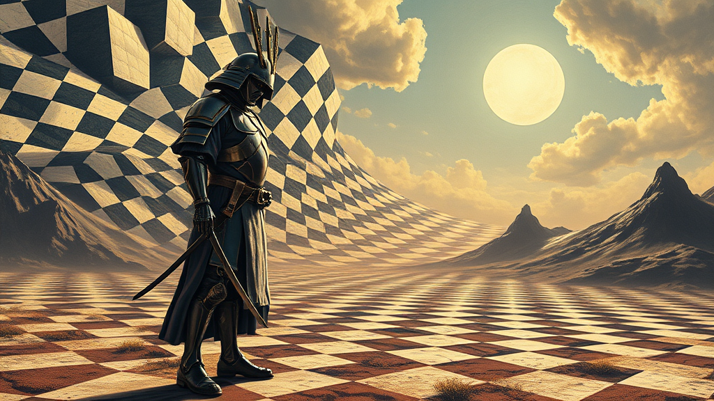 A schizophrenic nuclear samurai stands poised in a surreal landscape, the atmosphere tense with a tesselated AI omen. In the background, a distorted op art checkerboard pattern creates a dizzying visual effect, reminiscent of Jean Leon Gerome's intricate style. The samurai's armor gleams with a futuristic, metallic finish, subtly hinting at unstable energy. Shadows dance across the ground, as though predicting an uncertain future. The scene conveys a fusion of ancient tradition and dystopian technology, set against an expansive, impressionistic sky.