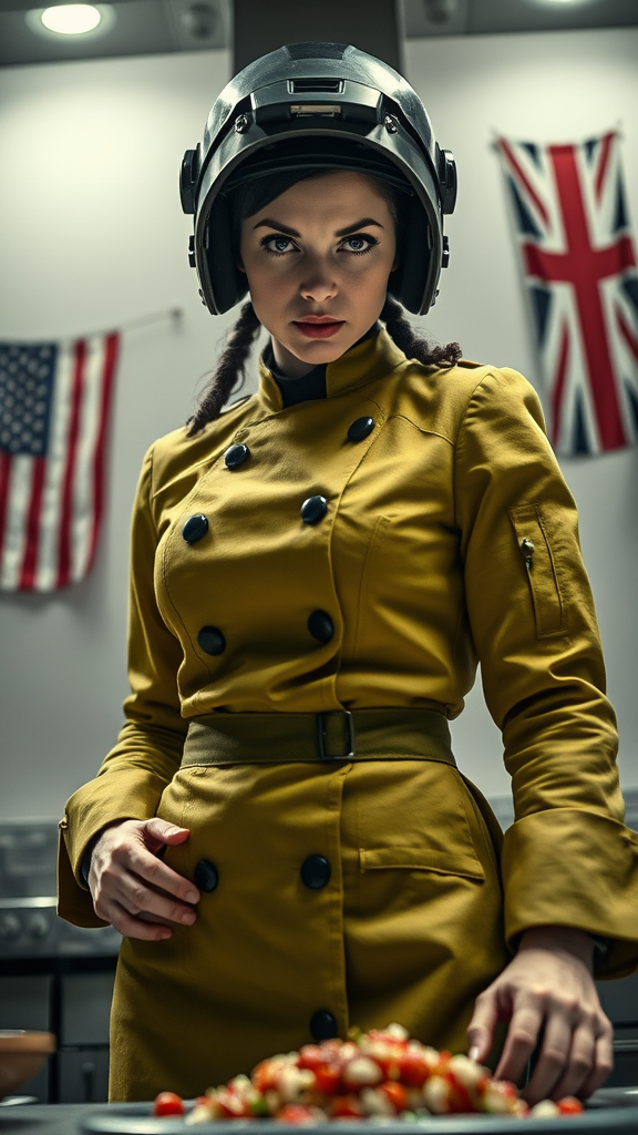 A seasoned, assertive female chef stands poised in the kitchen, her intricately detailed formal uniform a rich Earthy Chartreuse green. The fabric is meticulously rendered, with realistic folds and textures in a futuristic, Dieselpunk setting. Her eyes are wide and intense, a testament to her focus and determination, with an arched brow and an expression of fierce concentration. Bathed in dramatic cinematic lighting, she strikes a dynamic, action-packed pose, emphasizing her mastery in the culinary arts, despite finding the task of preparing monotonous dishes beneath her skills. The low-angle shot captures her full presence, highlighting her as larger-than-life against a simple, monochrome background with subtle noise. The chef, wearing a helmet with a hard surface, exudes power and authority. Flags bearing the stars and stripes and the union jack subtly decorate the backdrop, adding a touch of international flair to the scene. Her figure is impactful, exuding confidence and strength, elevated by the creatively subdued yet powerful setting around her.