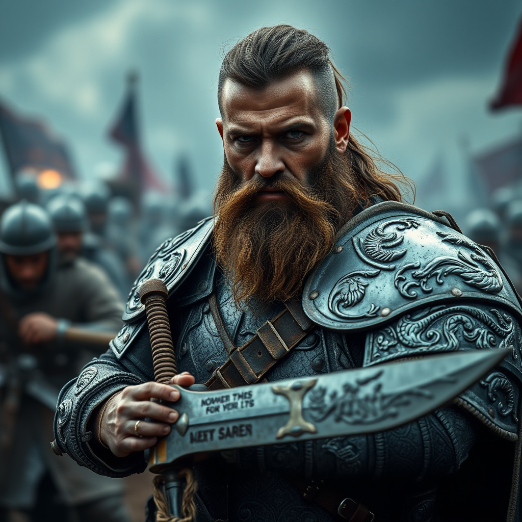 A seasoned warrior with a rugged beard and piercing eyes, clad in gleaming plate armor intricately engraved with mythical patterns, grips a weathered sword with firm resolve. He stands amidst the chaos of a stormy battlefield, the clang of steel and cries of battle echo around him. The dramatic lighting casts deep shadows across his determined face, highlighting the wear of countless battles. The scene captures a hyperrealistic and cinematic quality, offering an incredible 8k detail in a vertical composition, immersing the viewer in the raw intensity and stoic grace of a timeless hero amidst the turmoil.