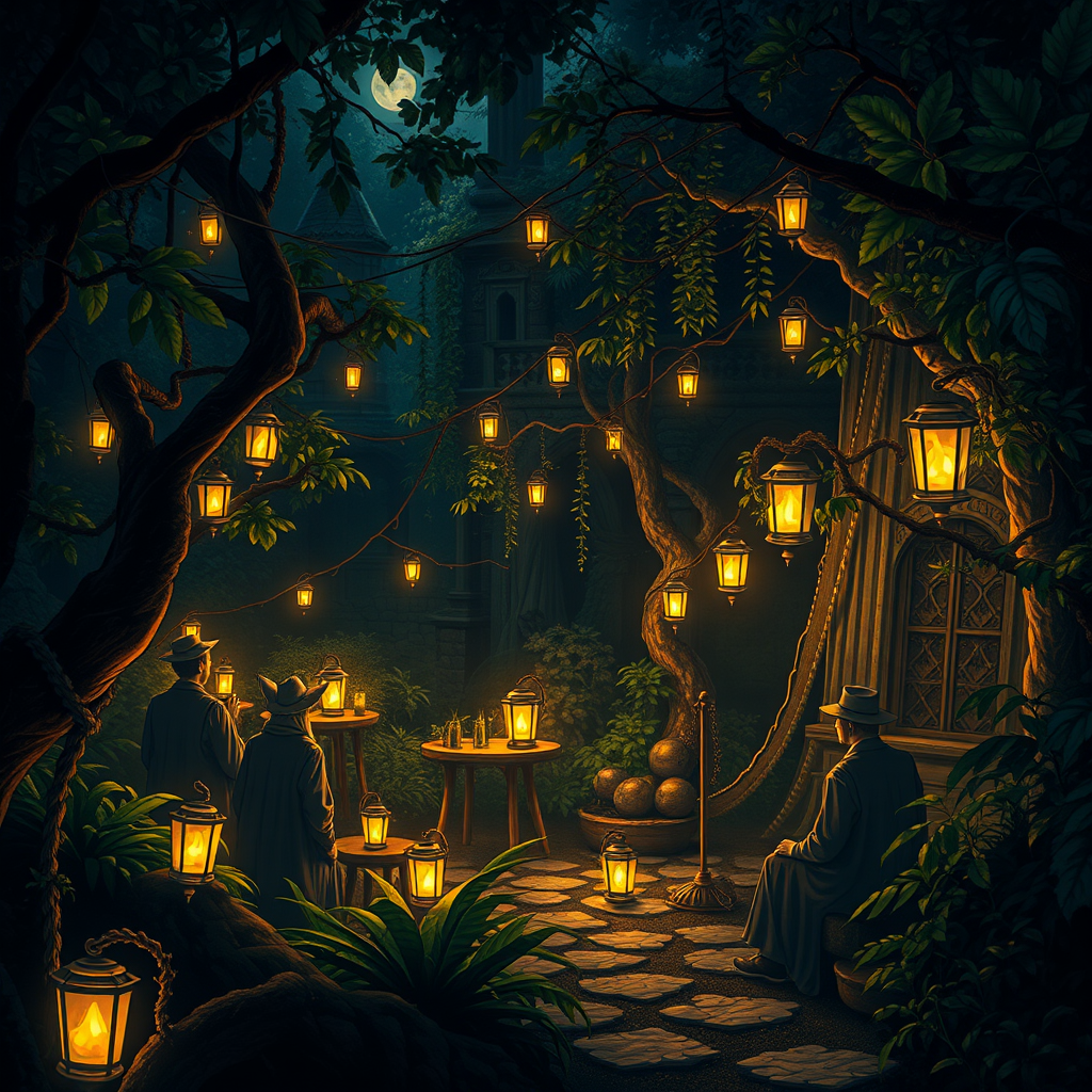A secret society gathers at midnight in a hidden garden, where whispers of ancient rituals and the glow of lanterns intertwine with the rustling leaves, creating a symphony of mystery and enchantment.