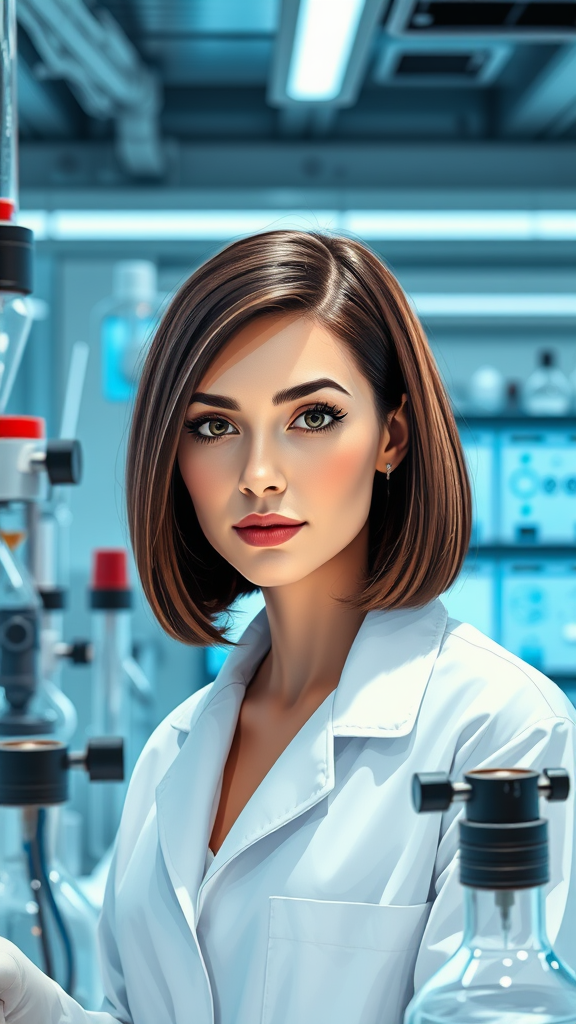 A self-assured female scientist with a sleek bob hairstyle and radiant hazel eyes, dressed in an immaculate white lab coat, is immersed in her experiments within an ultra-modern laboratory. The setting includes her upper body as she is captured in a half-body portrait. Her face is illustrated with the artistic grace of Henri Rousseau, rich in detail, set against a backdrop of advanced, futuristic scientific equipment, evoking an expressive and vibrant style.