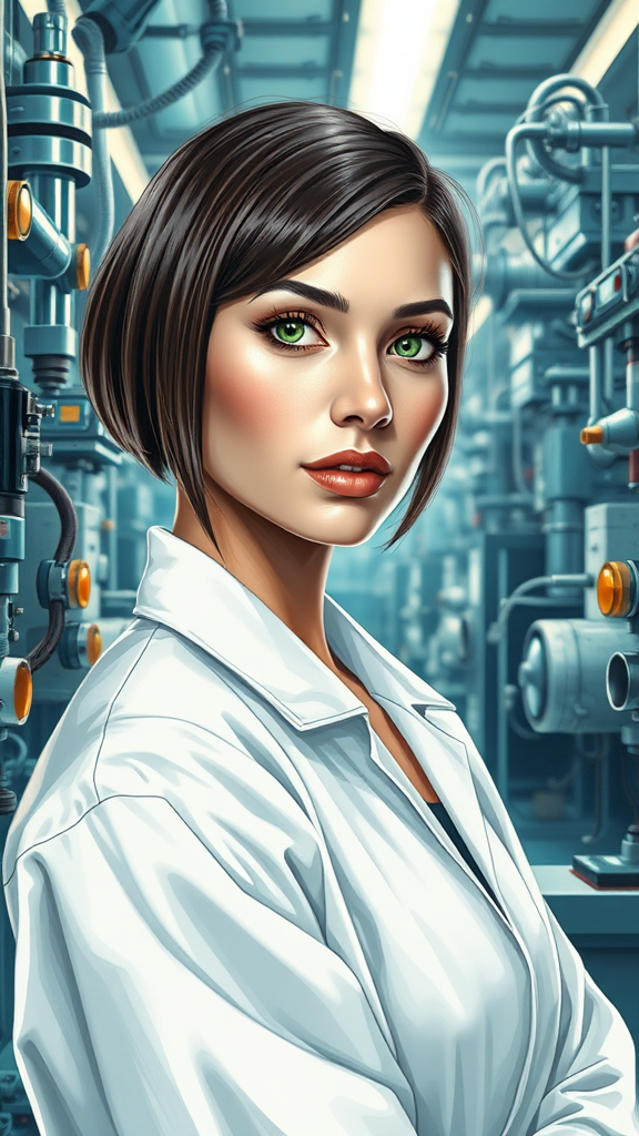 A self-assured woman scientist with a sleek bob cut and striking green eyes stands amidst the gleaming equipment of a state-of-the-art laboratory. She wears a spotless white lab coat and her expression reflects determination and intelligence. The scene captures her half-body portrait, rendered with the lush detail and artistry reminiscent of Henri Rousseau's style. The setting is infused with a futuristic ambiance, the background filled with complex and advanced technology. The artwork balances expressive flair with precise attention to detail.