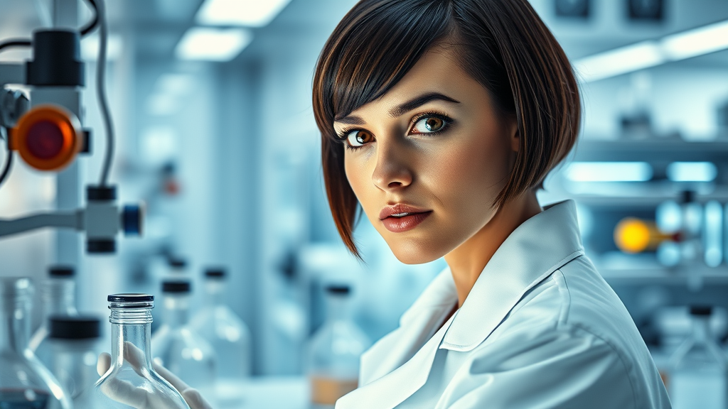 A self-assured woman scientist with a sleek bob cut and vibrant hazel eyes, dressed in an immaculate white lab coat, is immersed in her experiments within a cutting-edge laboratory. She is portrayed in a half-body portrait with a face rendered in the distinctive style of Henri Rousseau, showcasing meticulous detail. The backdrop features futuristic laboratory equipment, highlighting her intense focus and expertise. The ambiance is expressive and dynamic, capturing the synthesis of classic artistry and modern scientific innovation.