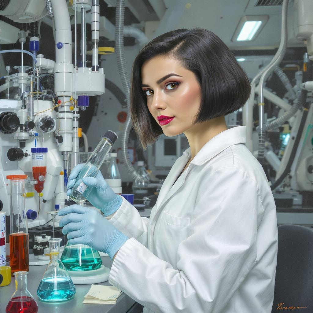 A self-assured woman scientist with a sleek bob cut and radiant hazel eyes, dressed in a crisp white lab coat, is engrossed in conducting experiments within a cutting-edge laboratory. Her half-body portrait, inspired by Henri Rousseau's refined style, showcases her determination and intellect against a backdrop of advanced, futuristic equipment, depicted in intricate detail with an expressive flair. Her poised stance and the subtle complexity in her expression capture the essence of innovation and discovery.