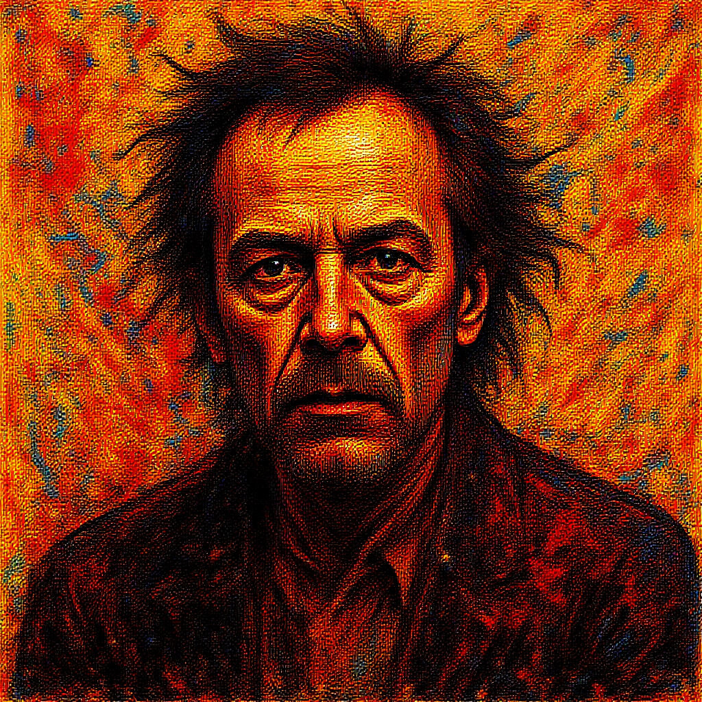 A self-portrait of Jackson Pollock painted in a dynamic explosion of colors and abstract forms, with vibrant splatters and energetic brushstrokes capturing the intensity of the artist's spirit, all set against a chaotic background that reflects his emotional depth and creativity.