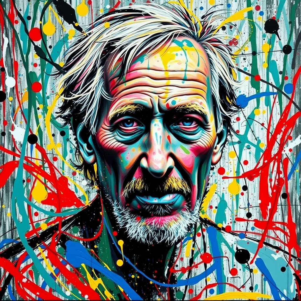 A self-portrait of Jackson Pollock, reimagined in a flurry of vibrant colors and chaotic patterns, capturing the raw energy and emotion of his artistic spirit. His face emerges abstractly within a whirlwind of swirling lines and splatters, reflections of his intense focus and unrestrained creativity. The canvas becomes a dance of paint and texture, evoking the essence of the artist in his most uninhibited form, blurring the boundaries between the man and his art.