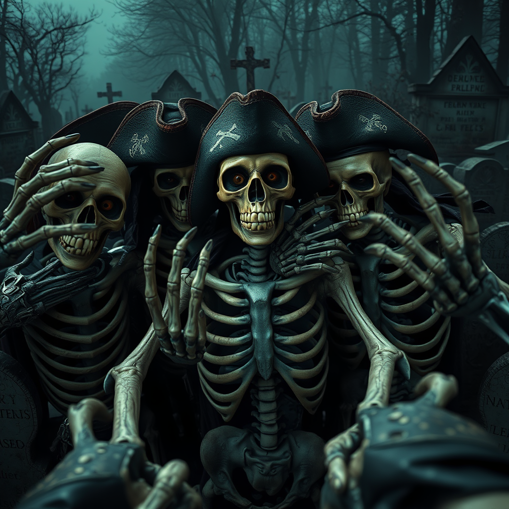 A selfie of a group of skeletons and pirates in a graveyard scene, creating a scary and dark atmosphere. The setting is dramatic and cinematic, bursting with vivid and extreme detail, projecting an intense energy. The visual is rendered in 16k resolution, ensuring UHD and HDR quality. The eerie figures have deformed irises and pupils, with some appearing cross-eyed, adding to the unsettling vibe. Among them are cloned faces and extra fingers, with mutated hands lending a surreal touch. The image is hauntingly atmospheric, capturing a moment of eerie camaraderie amidst the tombstones, without the need for text, signatures, or any identifying marks.