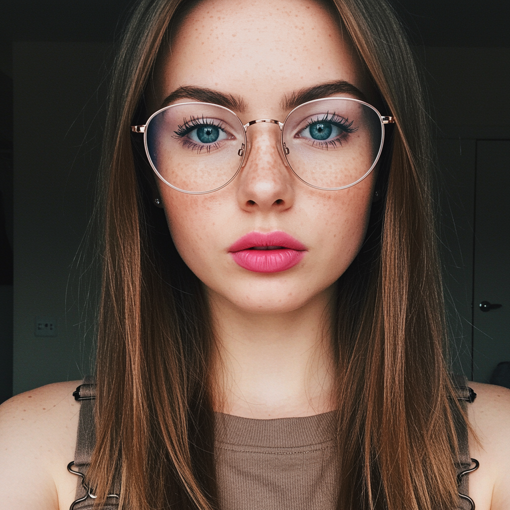 A selfie portrait of a stunning girl with mesmerizing dark blue eyes and straight brown hair, featuring stylish glasses perched on her nose. Her pink lipstick accentuates her slightly chapped yet alluring lips, complementing her freckled face and delicate, perfectly shaped nose. She dons fashionable leather overalls, capturing the essence of early morning light. The 1.4mm lens ensures a sharp focus on her captivating eyes. Subtle creative enhancements maintain her natural beauty while avoiding any distortions.
