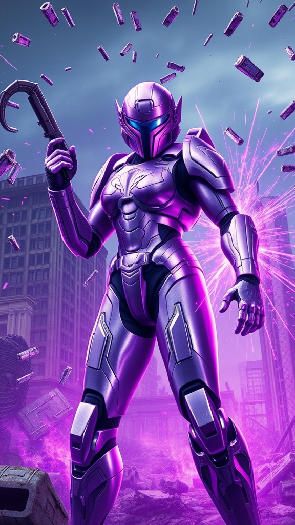 A sentinel-class Spartan-IV super soldier in gleaming lavender-plated armor stands imposing against the ravaged backdrop of a ruined Neo-Tokyo metropolis, her muscular physique a testament to rigorous genetic enhancements as she unleashes a barrage of devastating blows against an onslaught of enraged, hook-handed Xelkonian warriors. The air is alive with the wisps of a radiant purple aura that crackles and spits with ferocious energy, illuminating the darkened skies and casting an otherworldly glow upon the surrounding landscape. A hail of razor-sharp debris, lovingly rendered in breathtaking photorealistic detail, hurtles through the air in all directions, each shard and splinter meticulously textured and lit to showcase the unforgiving, high-velocity impact that it will soon unleash upon the hapless Xelkonians. Across her chest, a gleaming, intricately inscribed emblem emulates the sleek, futuristic aesthetic of her armor, whose delicate, latticework-like mechanisms are on full, thunderous display as she executes a majestic, dynamic pose, one leg planted firmly upon the ground and the other cocked into a forceful, blocking stance. Her visor glows with a soft, ethereal light, its darkened, lacquered surface reflecting the turbulent, nightmarish chaos that rages on around her, even as she pivots and spins with perfect, bladed dancer-like precision, her movements a testament to the fusion of martial prowess and technological might. In the background, the shattered, sprawling metropolis looms like a wounded colossus, its crumbling skyscrapers and splintered, light-spilled walls ablaze with ruin and devastation, their tired, worn surfaces receiving but fleeting, dreamlike attention in the midst of this all-consuming melee. Every detail – from the pockmarked, subatomic-precision convexity of the armor's surfaces to the anallog-enabled derailments of fall-outowing technological delights – bedazzles in an unwavering fusion of cutting-edge digital avant-gardism and assiduous, monumental studio craftsmanship that suggests both narrative rumination and gauged splendor.