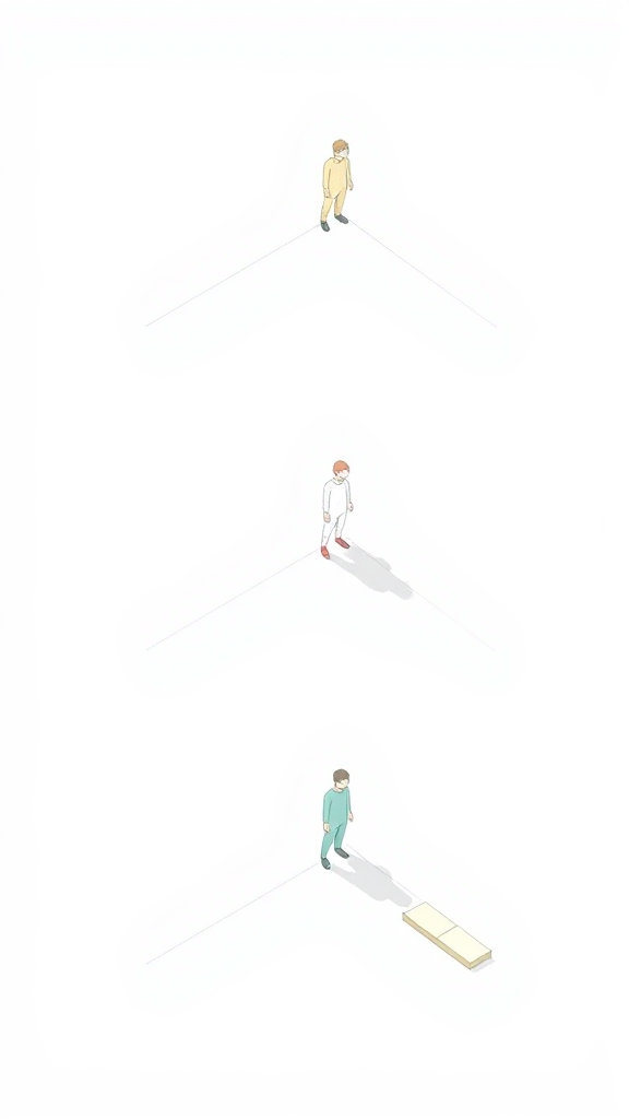 A sequence depicted in isometric view, created with delicate brushstrokes, set against a white background, employing minimalistic color schemes, showing subtle shadows and spaces, using understated hues.