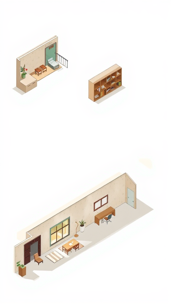 A sequence of scenes depicted in an isometric perspective, utilizing small, delicate brushstrokes against a white backdrop, with a limited palette, capturing the essence of spaces and shadows through minimalist hues.