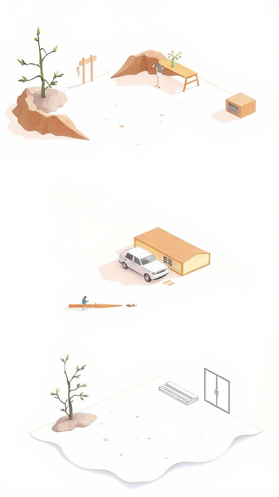 A sequence of scenes depicted in an isometric style, featuring delicate brushstrokes on a white canvas, employing a palette of simple colors. Spaces are subtly cast, maintaining a minimalist aesthetic with gentle variations in color and detail.