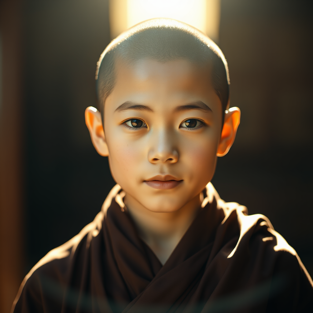 A serene and beautiful young zen monk portrait, with captivating features and a gentle expression, captured in radiant 8k resolution. The cinematic lighting casts a warm and inviting glow, while the 35mm f1.4 lens and Fuji color film enhance the natural hues and depth. The atmosphere conveys tranquility and wisdom, subtly enhanced by easynegative and ng_deepnegative_v1_75t tones, with a touch of artistic flair from bad-picture-chill-75v, creating a harmonious blend of realism and gentle creativity.