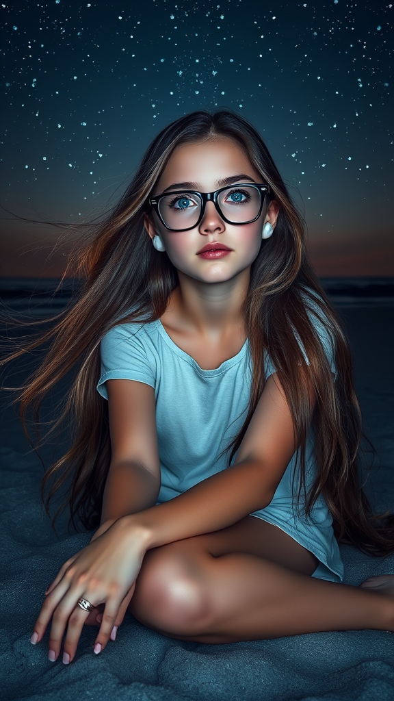 A serene and captivating girl with long flowing hair sits gracefully on the beach, her blue eyes gazing thoughtfully into the distance. Wearing glasses and AirPods, she exudes an air of elegance and quiet confidence. Her symmetrical features are accentuated by the starry night sky above, while hyper-detailed textures and glowing colors bring the scene to life. Captured in a full-body portrait, the natural lighting and intricate design showcase a landscape rich in depth and visual splendor. The highest detail quality and a wide-angle perspective, enhanced by cutting-edge lighting effects, create a stunning photo that immerses the viewer in the tranquility and wonder of the moment.