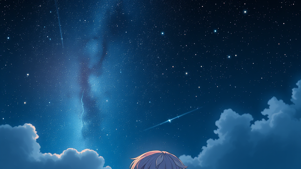 A serene and dreamy portrait of a girl in ethereal light clothing set against a starlit summer night sky, reflecting the delicate style of artist Oyari Ashito. The scene captures an innocent and tranquil ambiance, depicted with manga graphics and anime influence. The artwork combines dark exposure with vibrant colors for a striking contrast, showcasing the highest quality and intricate details. Viewed from a first-person perspective, the composition embraces dark tones and subtle clouds, embodying a sense of peaceful wonder and celestial elegance.