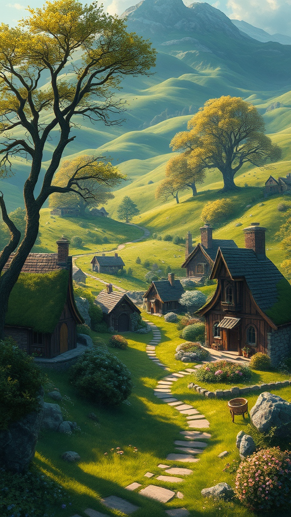 A serene and enchanting hobbit's shire, depicted as a full-body landscape painting, capturing the ethereal beauty of this mystical land. This masterpiece, inspired by the artistic styles of Ed Blinkey, Atey Ghailan, Studio Ghibli, Jeremy Mann, Greg Manchess, and Antonio Moro, radiates intricate detail and sharp focus. The composition is dreamlike and photorealistic, reminiscent of midjourney art meshed with the magic of SylvaMagic style. Each brushstroke brings to life a vivid tapestry of green hills and quaint hobbit homes, rendered in vibrant yet harmonious colors that create depth and warmth. This artwork, trending on ArtStation and CGSociety, combines the animation charm with high-detail oil painting. While evoking a sense of wonder and tranquility, it subtly blurs the boundaries between reality and fantasy, merging elements in a fluent, seamless manner. The scene is carefully balanced with no distortions or anomalies, ensuring that each detail complements the other, allowing viewers to be transported into this fantastical realm.