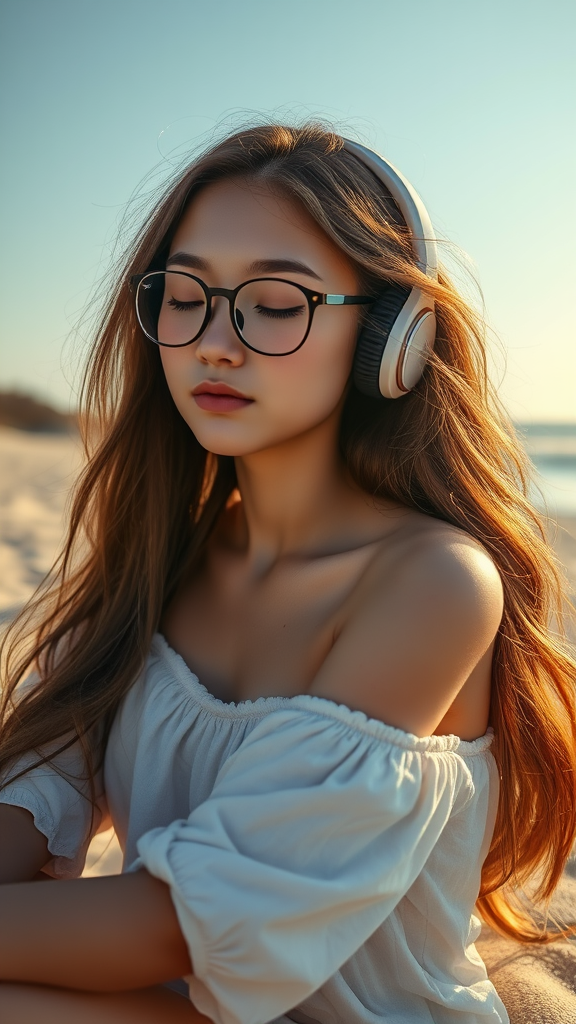 A serene and gentle girl with long flowing hair sits serenely on the sandy beach, eyes softly closed as she enjoys the rhythms of her favorite music through her headphones. Her face, framed by delicate, symmetrical features and complemented by stylish glasses, exudes an angelic tranquility. The sunlight casts glowing colors on her peaceful expression, highlighting the intricate details of her surroundings and the natural beauty of the scene. Captured in reverse shot, the full-body portrait reveals her relaxed posture and graceful presence, amplified by wide-angle depth of field and captured in hyper-detail. The beach landscape forms a breathtaking backdrop, resonating with the warmth of natural lighting and intricate design. The entire scene is beautifully rendered with vision and the highest quality detail, reminiscent of RTX ray-traced 16k photography.