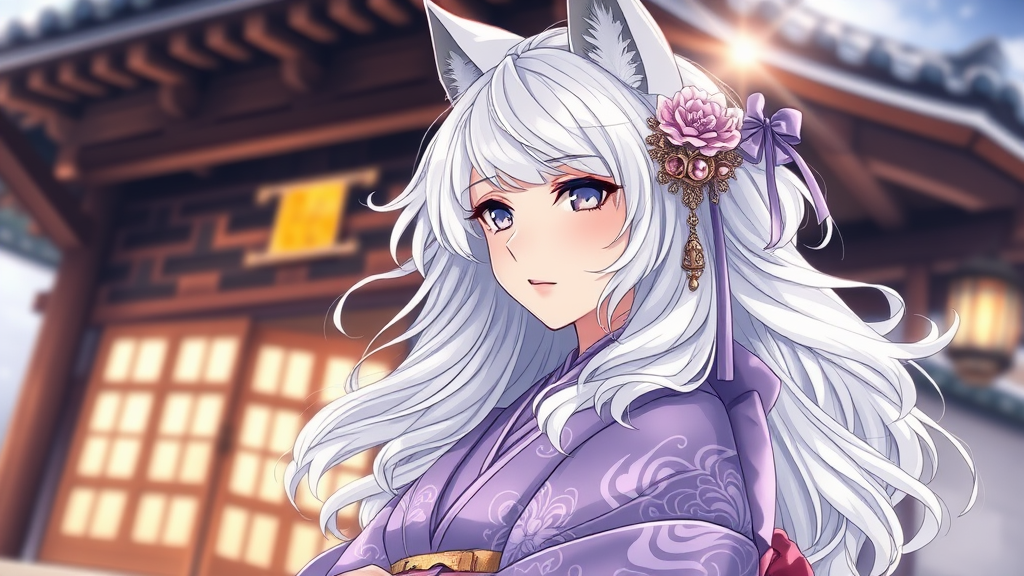 A serene and radiant anime wolf girl with snowy white hair adorned with wavy locks, exquisitely draped in a lavender-purple kimono. Her ethereal beauty is captured in a close-up portrait, where soft lighting caresses her graceful features, enhanced by a gentle blur and a delicate sun flare. Her pose is elegant and enchanting, accentuated by intricate accessories that add to her charm. The kimono is richly detailed, reflecting traditional patterns and textures. The backdrop showcases a beautifully detailed Japanese building, encapsulated in a hyperdetailed, masterful composition. Rendered in ultra-high definition, capturing the trend on art platforms like Pixiv.