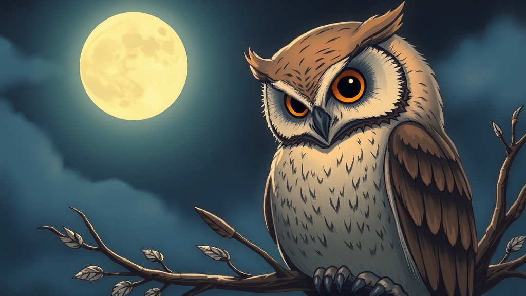 A serene and tranquil owl with wise, knowing eyes delicately paints a calming artwork under a peaceful moonlit night, capturing the harmony of nature. The owl exudes a sense of wisdom and calmness in its demeanor, reminiscent of Studio Ghibli's enchanting style. The scene is infused with subtle influences from Steve Ditko, with detailed feathers and an ethereal background that emphasizes tranquility, evoking a sense of peace and creativity in a raw, unrefined style.