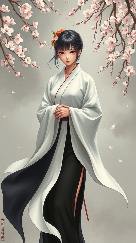 A serene anime girl in a flowing white ensemble, delicately holding a traditional Japanese garment, complemented by a sleek black skirt, rendered in the evocative style of classical Chinese painting. Infused with elements of romantic fantasy, the scene is depicted with the rich textures of oil painting, utilizing a palette of dark bronze and soft gray hues. She stands amidst a gentle cascade of cherry blossoms, her face calm and timeless, displaying an almost photo-realistic quality. Envisioned against an ethereal backdrop, her presence evokes a sense of tranquil elegance and subtle mystique.