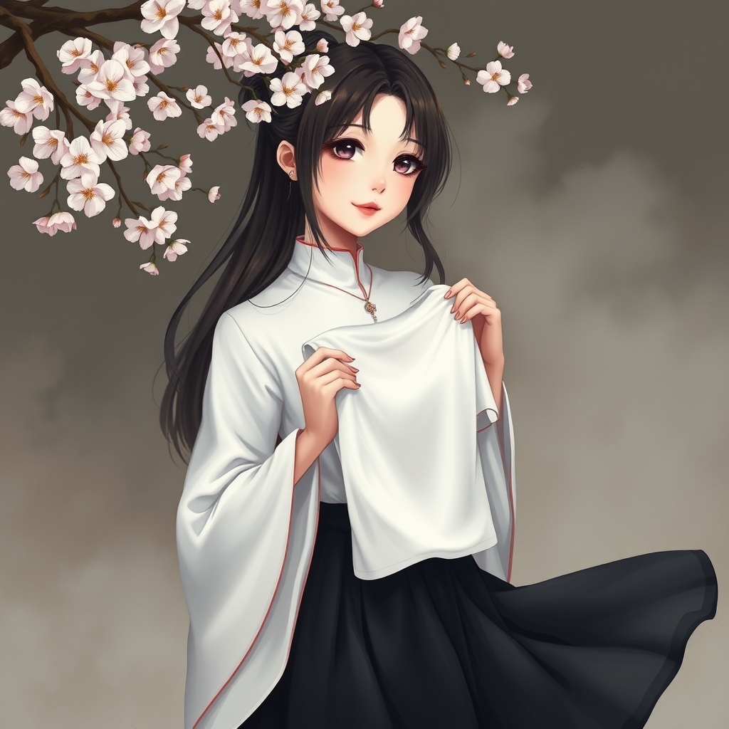 A serene anime girl in an elegant white ensemble holds a Japanese t-shirt delicately, complemented by a flowing black skirt. Her presence exudes the charm of traditional Chinese painting, blending romantic fantasy with the richness of oil paintings. Dark bronze and gray tones accentuate the composition, as cherry blossoms gently cascade around her. Her face, serene and contemplative, is rendered with photo-realistic techniques, capturing a harmonious fusion of styles and cultures.