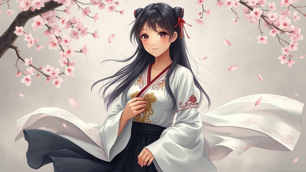 A serene anime girl with delicate features is depicted in a traditional Chinese painting style, adorned in an ethereal white ensemble that sways gently around her. She holds an intricately designed Japanese t-shirt, contrasting with a flowing black skirt that adds depth to her attire. Cherry blossoms flutter around her, their soft petals a whimsical touch to the romantic fantasy scene. The color palette embraces dark bronze and subtle grays, lending an antique yet vibrant quality to the oil painting aesthetic. Her tranquil expression exudes peace and elegance, enhanced by photo-realistic techniques that capture every nuance of her serene face amidst the blossom-strewn backdrop.