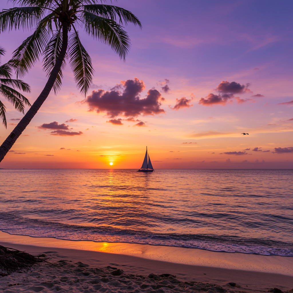 A serene beach at sunset with the sun dipping below the horizon, casting vibrant hues of orange, pink, and purple across the sky. Gentle waves lap at the shore, where a lone palm tree leans slightly over the sand. In the distance, a sailboat glides across the water, its sails catching the last light of the day. A few scattered clouds reflect the brilliant colors of the sky, and a couple of seabirds can be seen flying near the horizon, adding a touch of life to the tranquil scene.