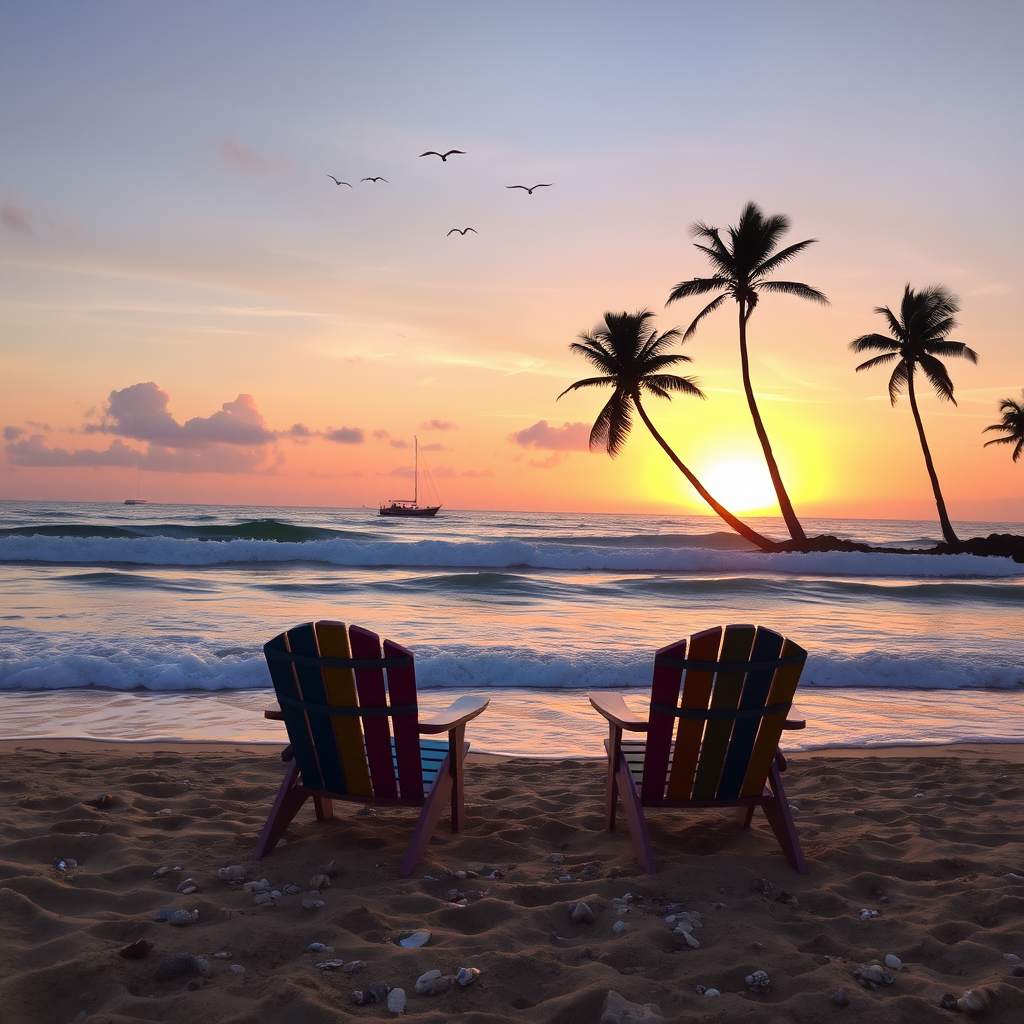 A serene beach scene during sunset, the sky painted with hues of orange, pink, and purple as the sun dips below the horizon. Gentle waves roll onto the shore, where seashells and small rocks are scattered across the golden sand. In the foreground, two colorful beach chairs sit empty, facing the soothing ocean. A silhouette of a distant sailboat glides across the water, and a flock of seagulls flies overhead. A few palm trees sway gently in the light breeze, their shadows stretching across the sand.