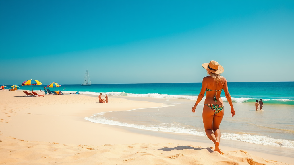 A serene beach scene with a woman in a vibrant swimsuit enjoying a bright, sunny day, surrounded by soft golden sand and the sound of gentle waves lapping at the shore, as colorful beach umbrellas dot the landscape and a distant sailboat glides across the deep blue sea.