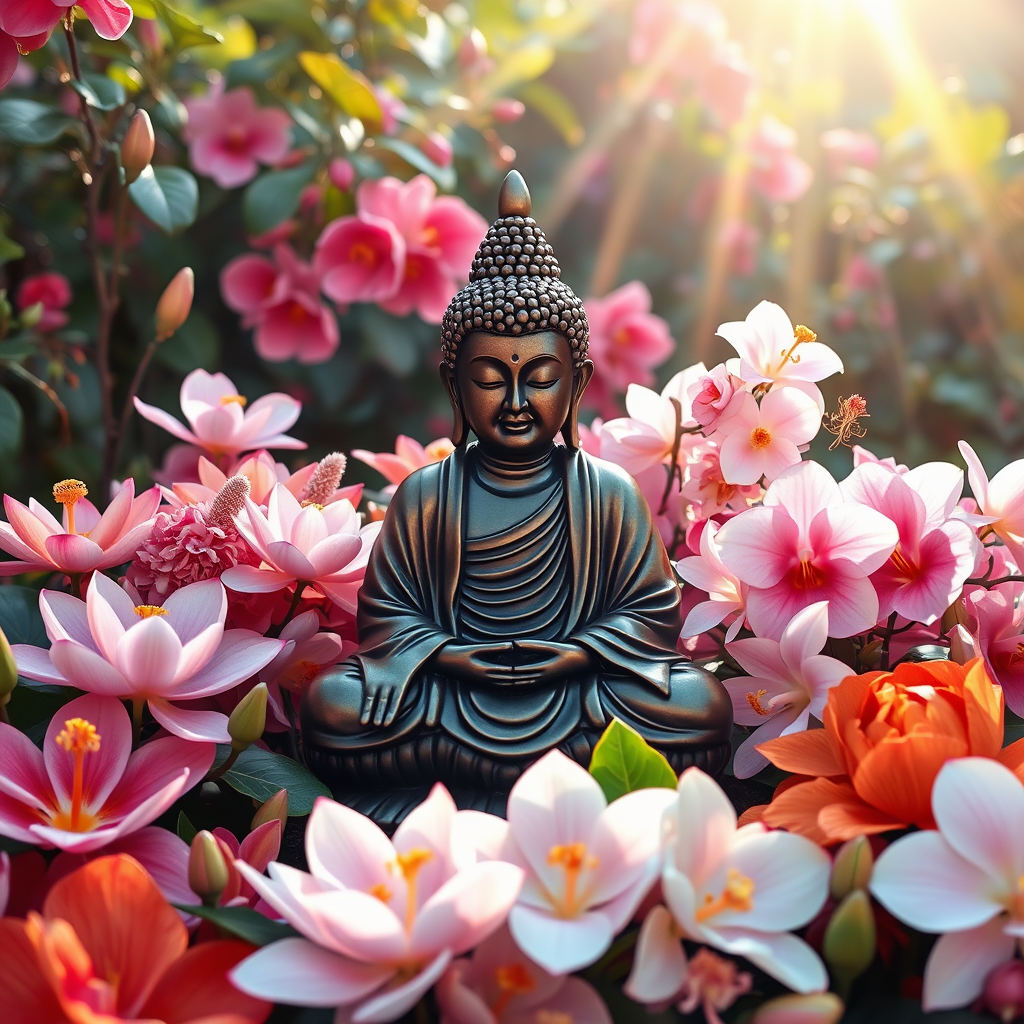A serene bronze Buddha statue surrounded by a vibrant array of blossoms, including lotus, hibiscus, and orchids, each flower in varying shades of pink, orange, and white, with gentle rays of sunlight filtering through, casting a warm and tranquil glow over the scene.