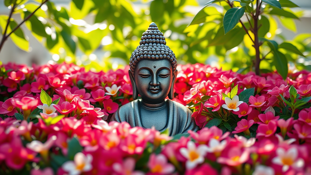 A serene Buddha statue nestled amidst a vibrant sea of blooming flowers, each petal a burst of color, as sunlight filters through lush green leaves to cast a gentle glow on the tranquil visage, creating a harmonious blend of nature and spiritual calm.